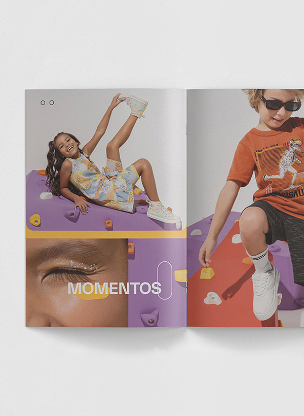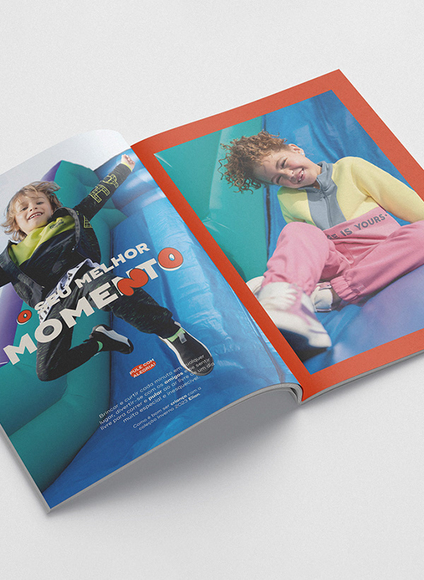 Catálogos de moda são desenvolvidos seguindo etapas sólidas, que começam com pesquisa e apresentação ao cliente, passando pelo desenvolvimento do projeto gráfico, direcionamento de fotografia, acompanhamento da produção e direção fotográfica, com participação ativa em todas as fases. Projetos foram realizados em parceria com marcas como Elian, Nanai, Colorittá, Lecimar, Kyly, Brandili, Angerô, Fenalu, Manike, entre outras. Produção Executiva: Estúdio Grima / Fotografia: Fran Jung/Wall Aquino.
